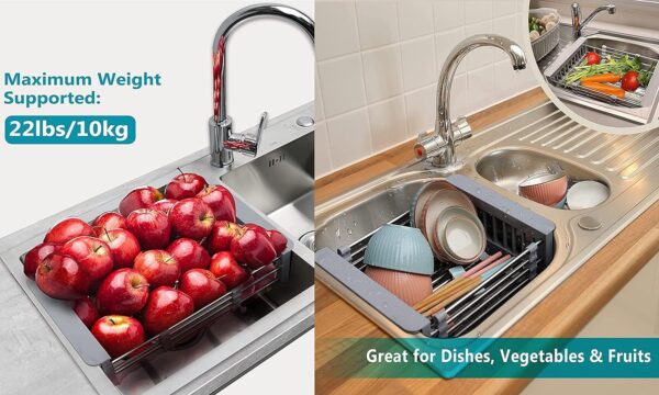 • Multifunctional :– This stainless steel sink dish drying rack is handy for air-drying dishes, cups, rinsing fruits and veggies.